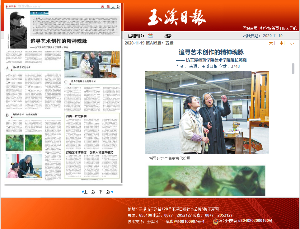 近日,《玉溪日报》记者采访了玉溪师范学院美术学院院长郭巍,以人物专访的形式发表了题为《追寻艺术创作的精神魂脉——访玉溪师范学院美术学院院长郭巍》的报道(2020年11月19日第A05版),围绕郭巍院长扎根美术学院36年潜心创作和教学的历程,讲述了他成长为云南高校教学名师、云岭名师的艺术探索与思想感悟,他怀揣对优秀传统文化保护与传承的敬畏之心,以师者传道、授业、解惑的情怀,“学为人师、行为世范”的精神境界守护着莘莘学子的性灵之光、人伦真纯。字里行间能感受到郭巍院长扎根玉溪师范学院36年来从未褪色的热忱与活力。