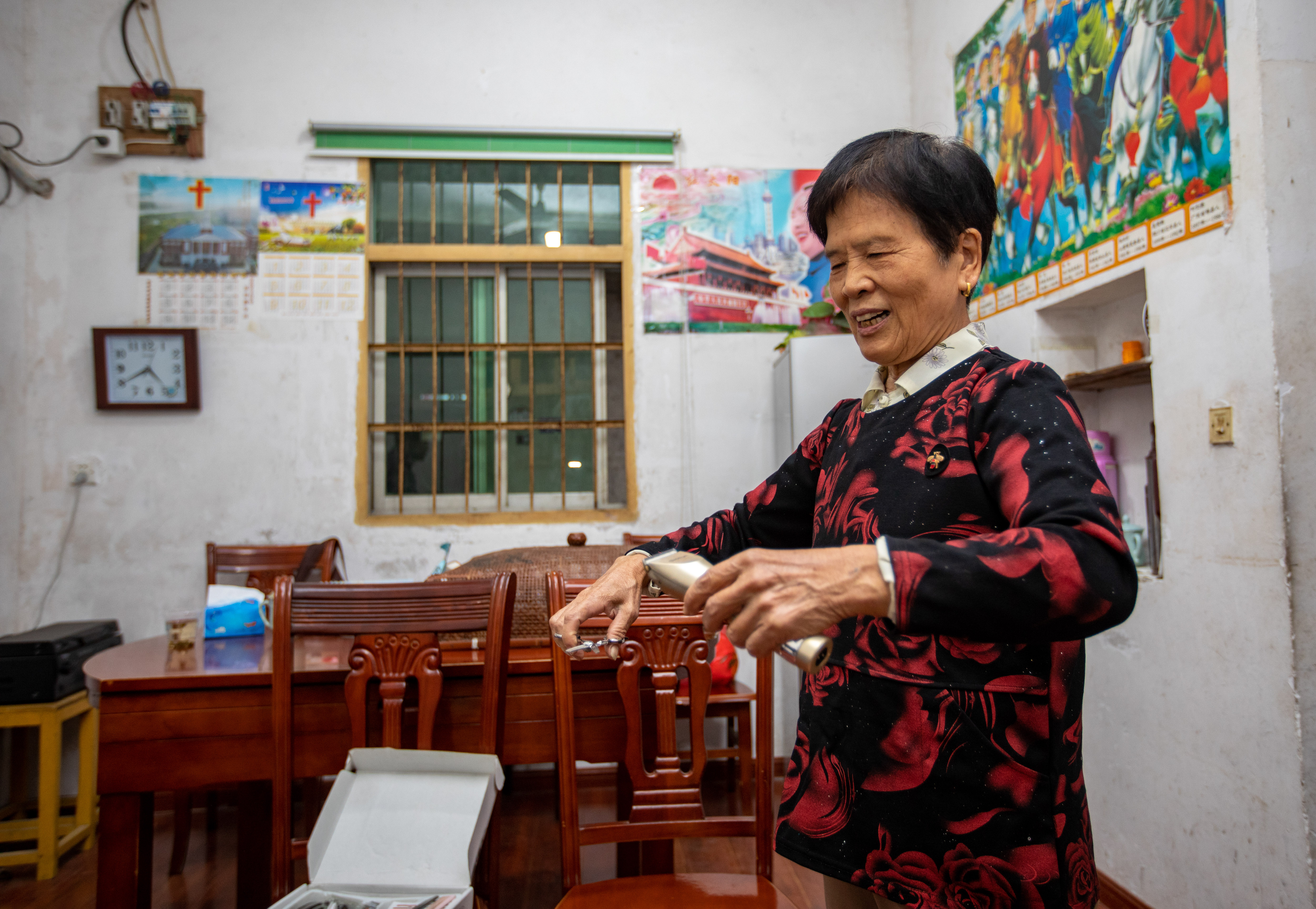 沈金香正在准备理发工具。浙江省金华市金东区文明办 杨梅清 摄