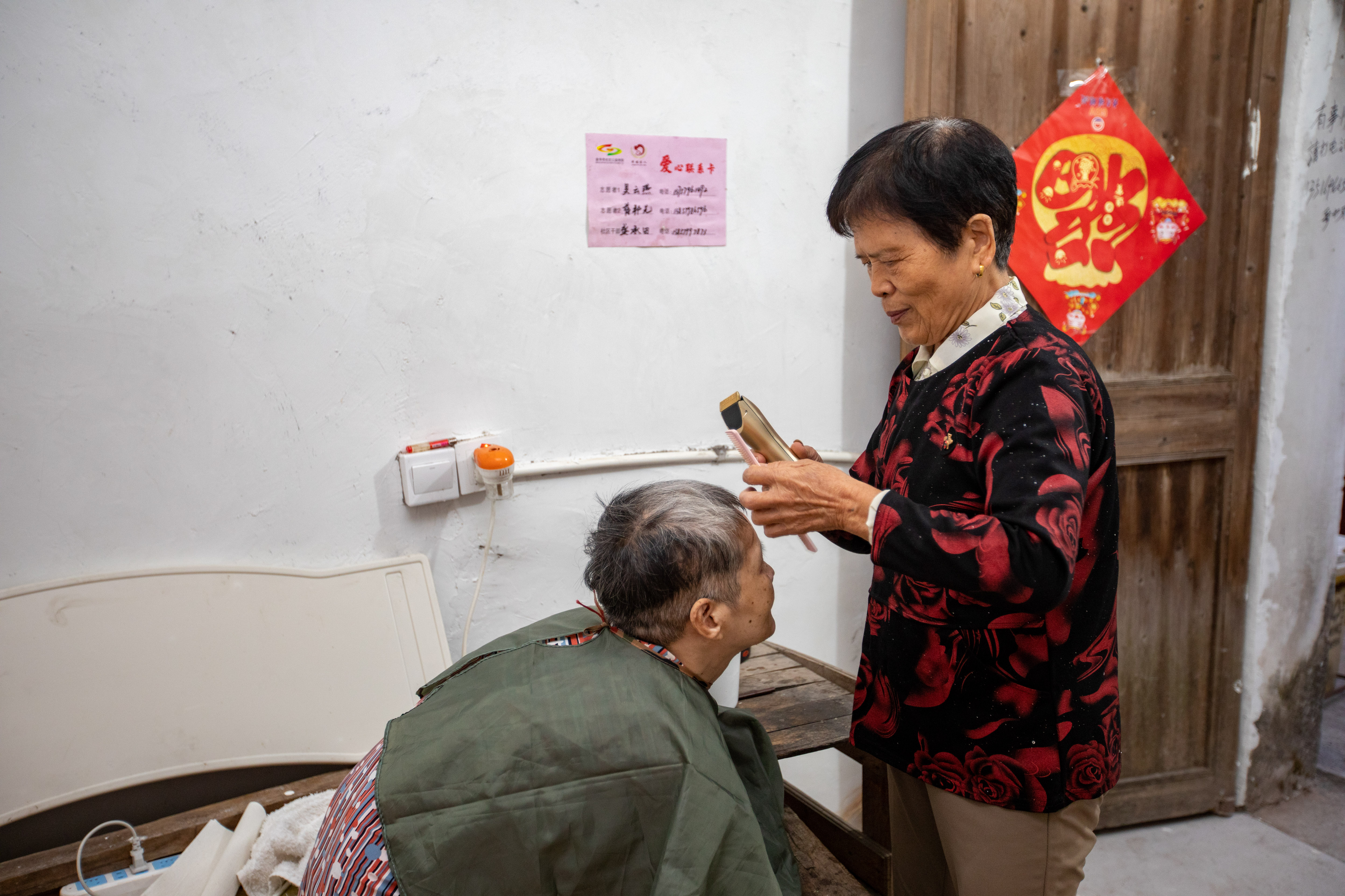沈金香为盛月仙理发。浙江省金华市金东区文明办 杨梅清 摄