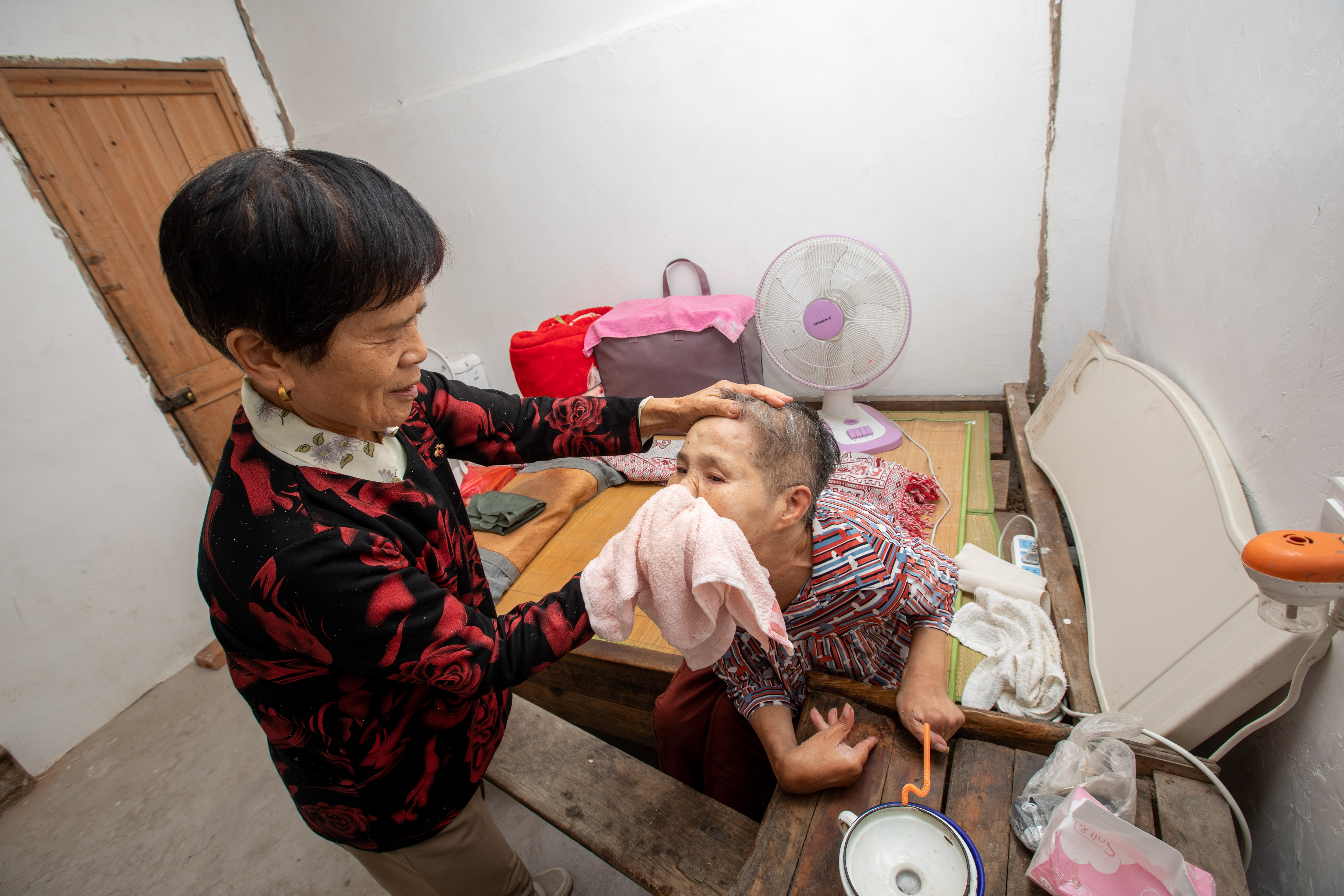 沈金香为盛月仙擦脸。浙江省金华市金东区文明办 杨梅清 摄