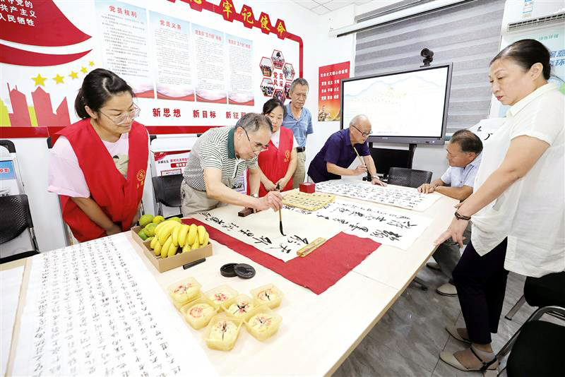 在吴樾社区新时代文明实践站,志愿者组织书法爱好者现场创作书法作品。记者 江胜 通讯员 潘家凤 摄
