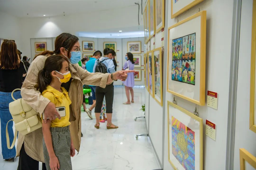 家长带孩子参观“童心向党·科技自贸”少年儿童绘画大赛作品。康登淋 摄