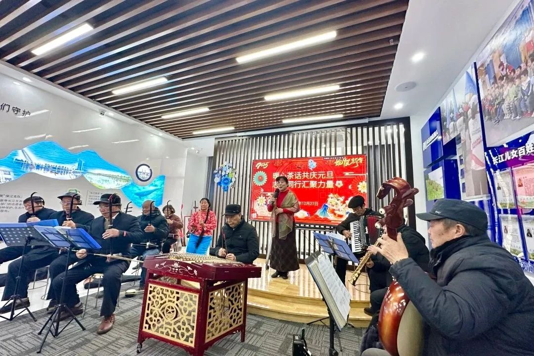 文明实践中心过元旦”活动。现场精心装饰新年氛围背景墙,四十余名文艺爱好者进行文艺