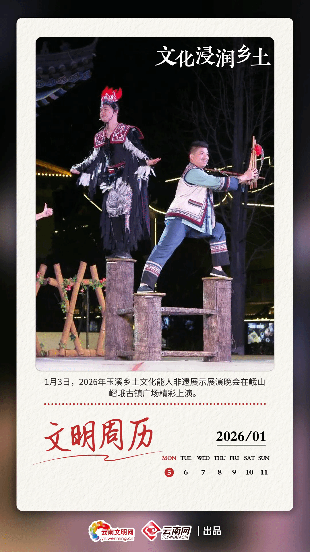 1月3日,“同唱一首歌 同为一家人”行走嶍峨・多彩非遗——玉溪市非遗保护传承体验示范基地2026年玉溪乡土文化能人非遗展示展演晚会在峨山嶍峨古镇广场精彩上演,来自易门县文化馆的演职人员携具有本土特色的非遗节目登台,用精湛的演绎为市民送上一场文化大餐。